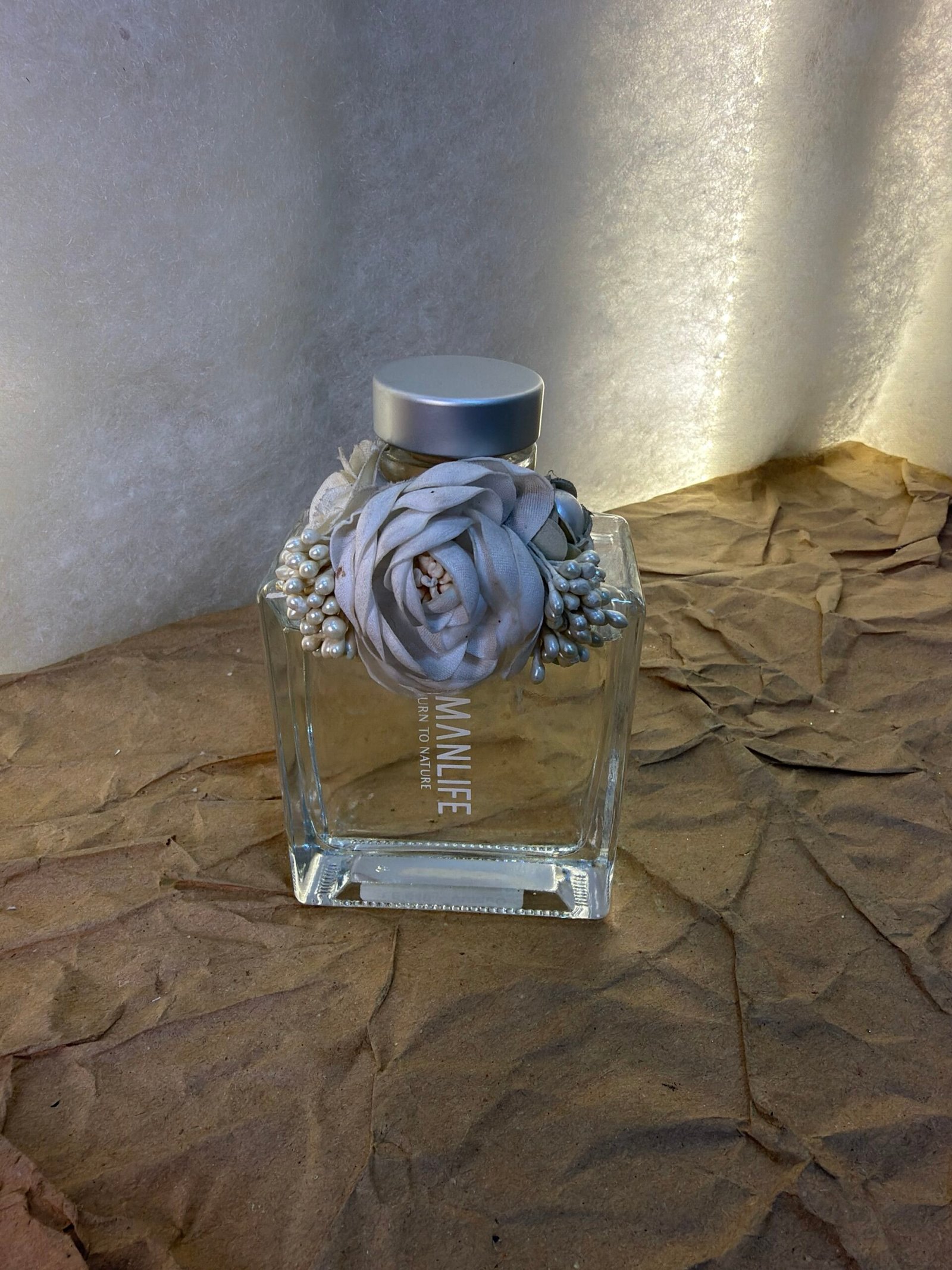 A stylish reed diffuser bottle featuring a clear square design with a silver cap. Decorated with a fabric flower and pearl accents for an elegant touch. Perfect for filling with your favorite fragrance oils to gently scent any room.