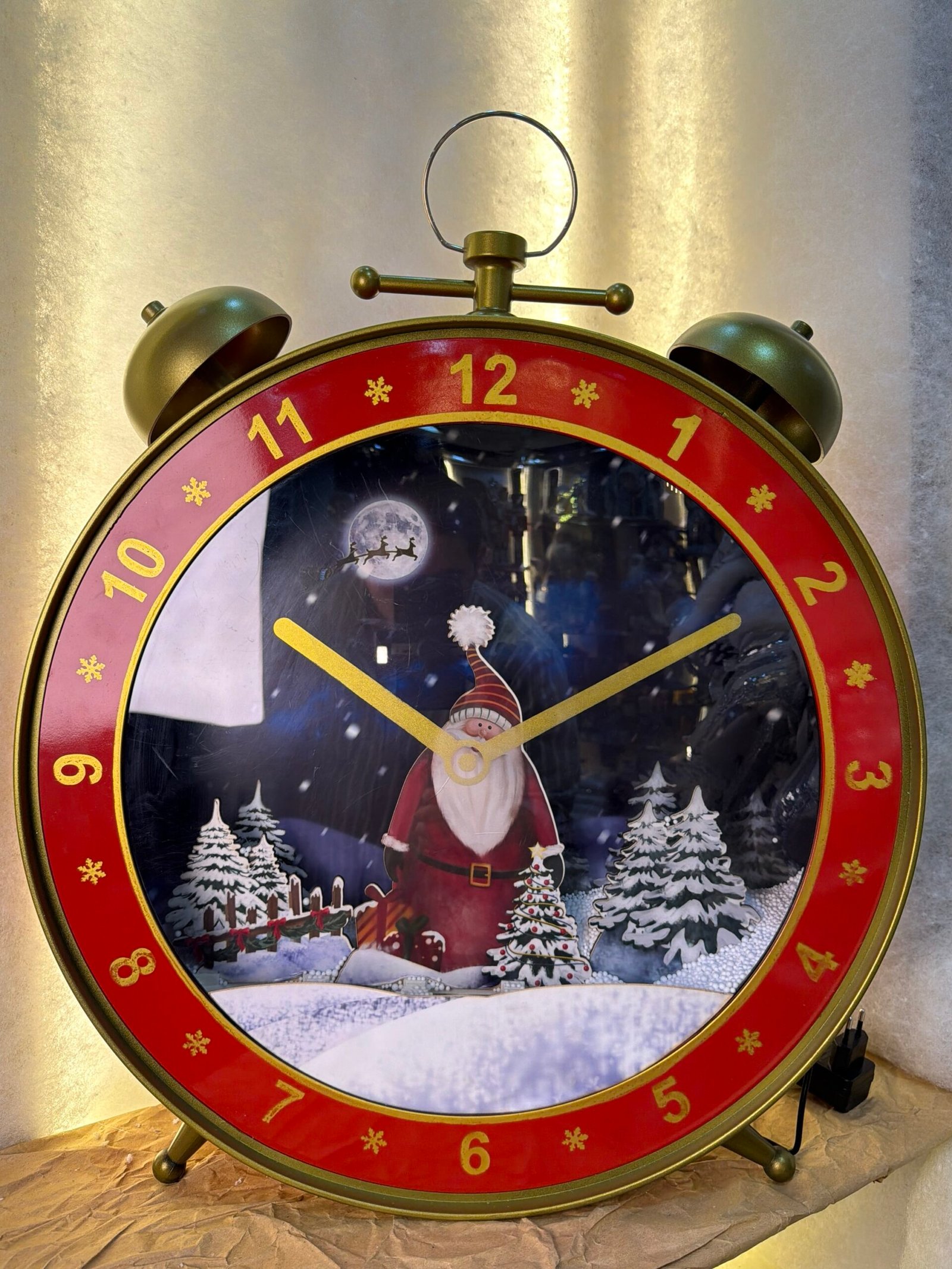 ساعة إنذار كبيرة بستايل كلاسيك مع مشهد شتوي جميل لسانتا كلوز. مصممة بألوان احتفالية دافئة ولمسات ثلجية، وتعتبر إضافة مثالية لديكورات الكريسماس في البيت أو للمحلات والهدايا.