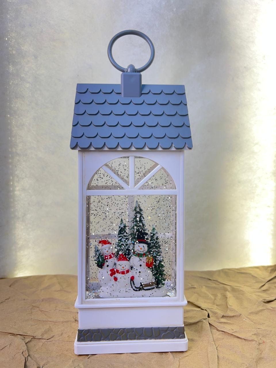 A winter lantern featuring a cheerful snowman family surrounded by pine trees, with floating glitter for a magical snowy effect. A festive and heartwarming decoration.