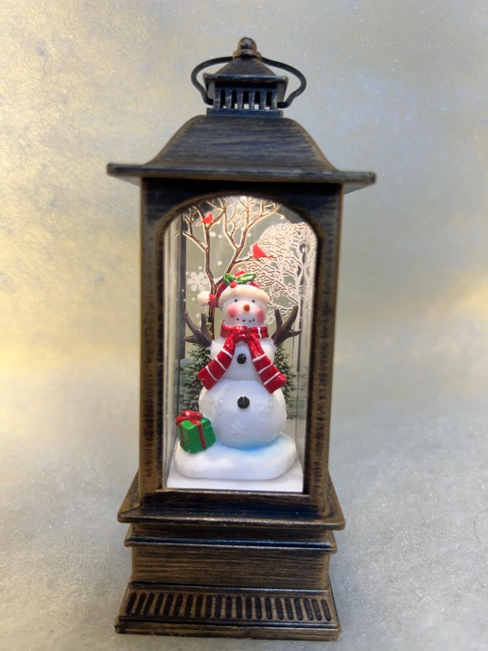 A vintage-style lantern featuring a cheerful snowman with a gift and a winter forest backdrop. A cozy and charming addition to your holiday décor.