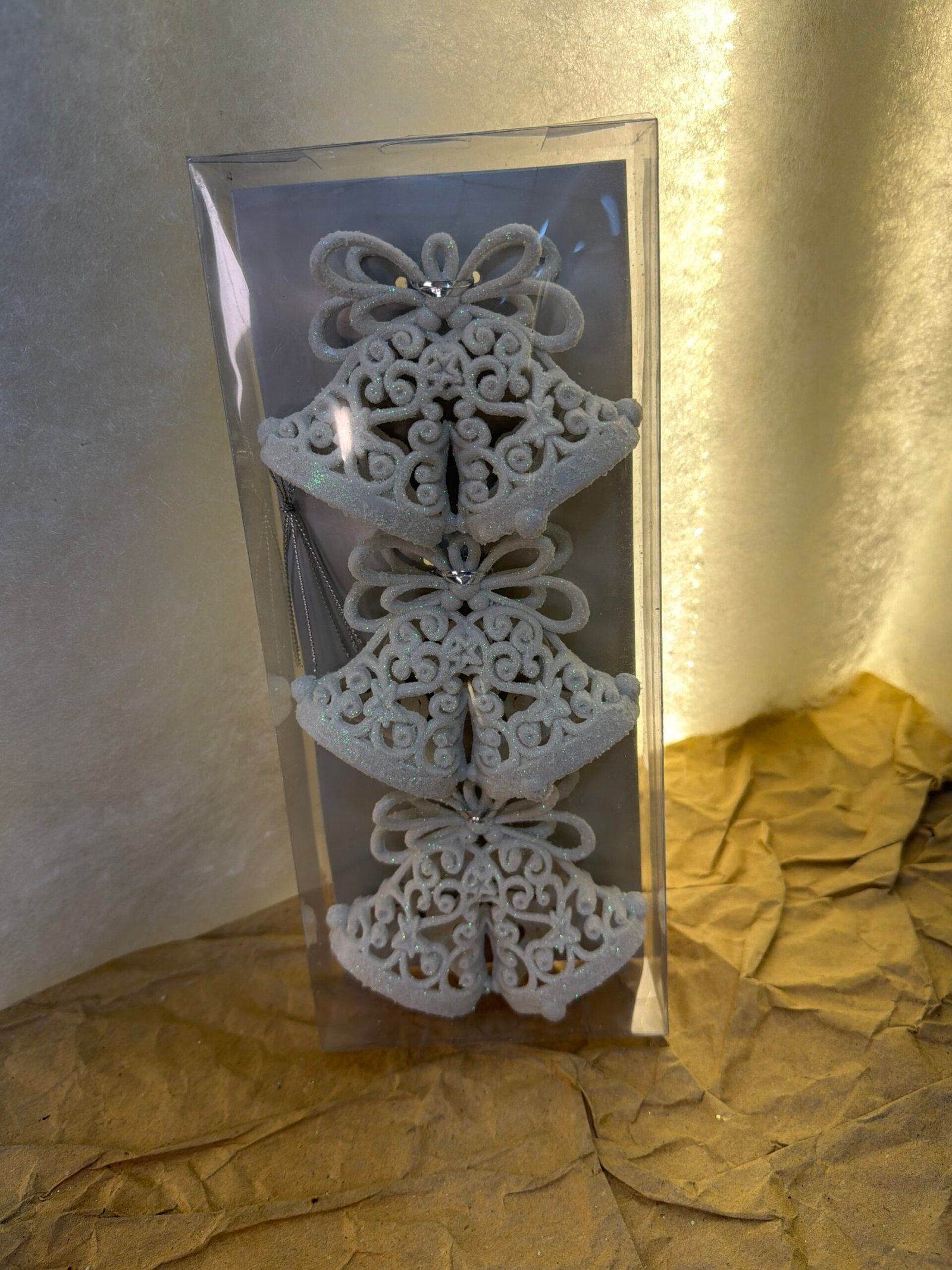 علبة شفافة تحتوي على ثلاث قطع من زينة الكريسماس على شكل أجراس بيضاء لامعة. كل جرس مزخرف بتصميمات متعرجة ولامعة وبها لمعة فضية خفيفة، ومع كل قطعة شريط للتعليق